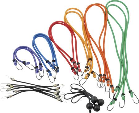 Bagageremmesæt i box med 22 dele: Indeholder 12 stk Ø 8 mm bagageremme i længder fra 30-105 cm og 10 stk Ø 4 mm bagageremme i længderne 150 og 250 cm. Bagageremmene er i forskellige farver alt efter længderne, så det ... Se mere
