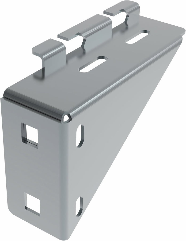 Vægophæng til elforzinkede gitterbakker. Gitterbakken låses mod loftophænget med klemmer som bøjes ned.