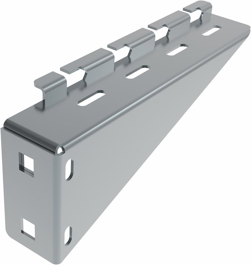 Vægophæng til elforzinkede gitterbakker. Gitterbakken låses mod loftophænget med klemmer som bøjes ned.