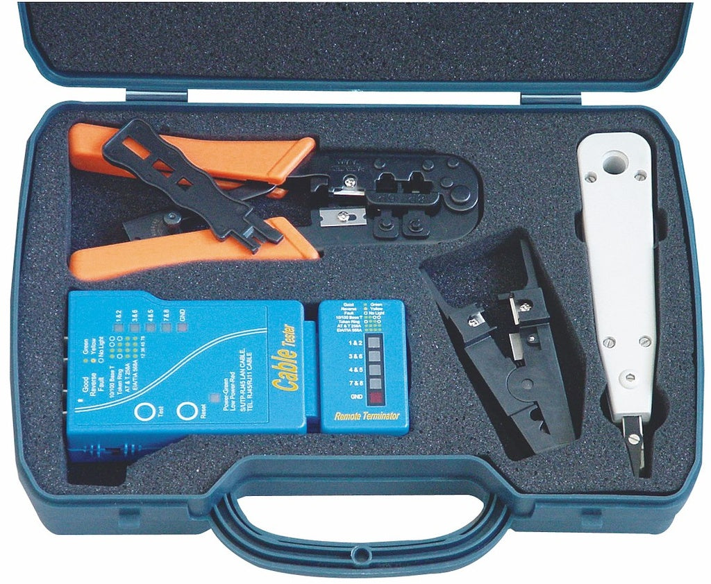 • 1 stk kabeltester ”42 091 65” til at teste tele- og datakabler med RJ45-RJ12- og RJ11-kontakter.