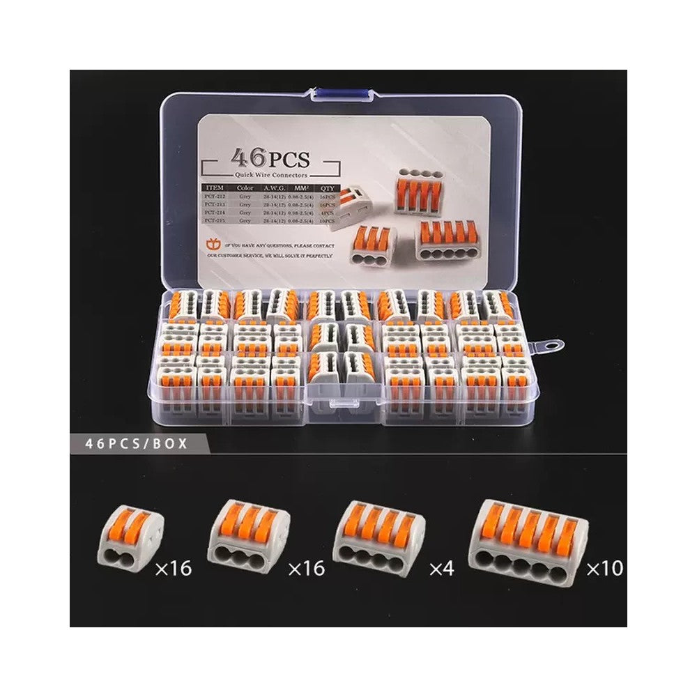 46 stk. Skrueløse samlemuffer - til 2/3/4/5 ledninger, 0,32-2,5mm2, 230V input