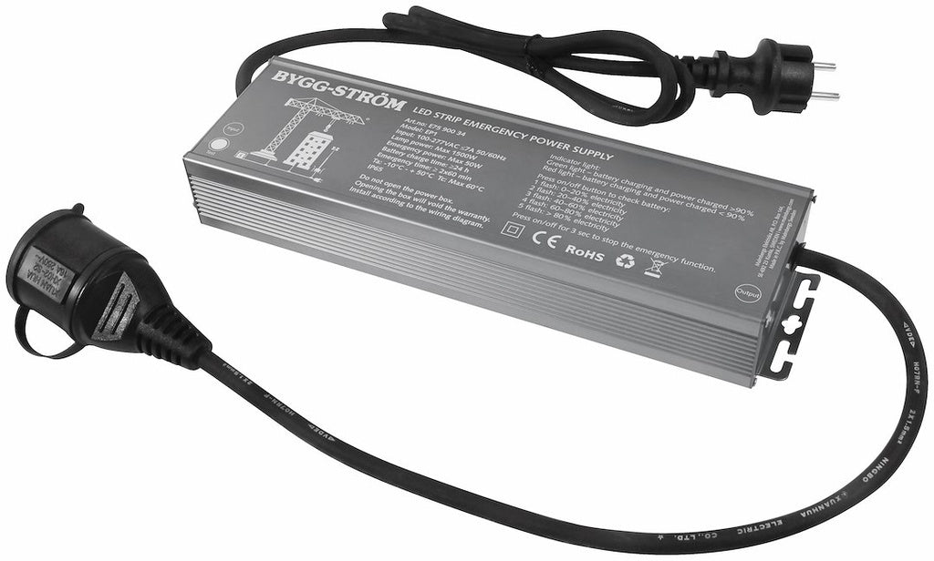 Nødbelysningsenhed til Bygstrøm LED-strip som giver 1+1 times batteribackup. Ved strømafbrydelse kobler enheden ind og dæmper ned til 30% og lyser i 1 time. Ved fortsat strømafbrydelse lyser den yderligere 1 time. Kna... Se mere
