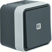 Berker afbryder m/tryk NO kontakt grå komplet m/underlag. Blå LED enhed. Koblingsstrøm 10AX 250V IP55 m/en indgang til 2 kabler og en indgang til kabel og rør. Plug-in klemmer.