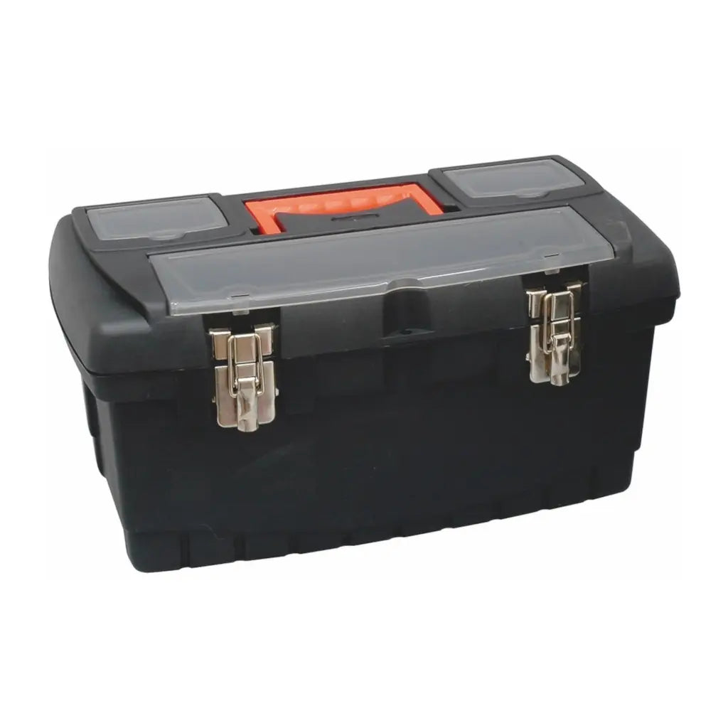 Værktøjskasse i kraftig plast. Med sortimentskasser i låget.