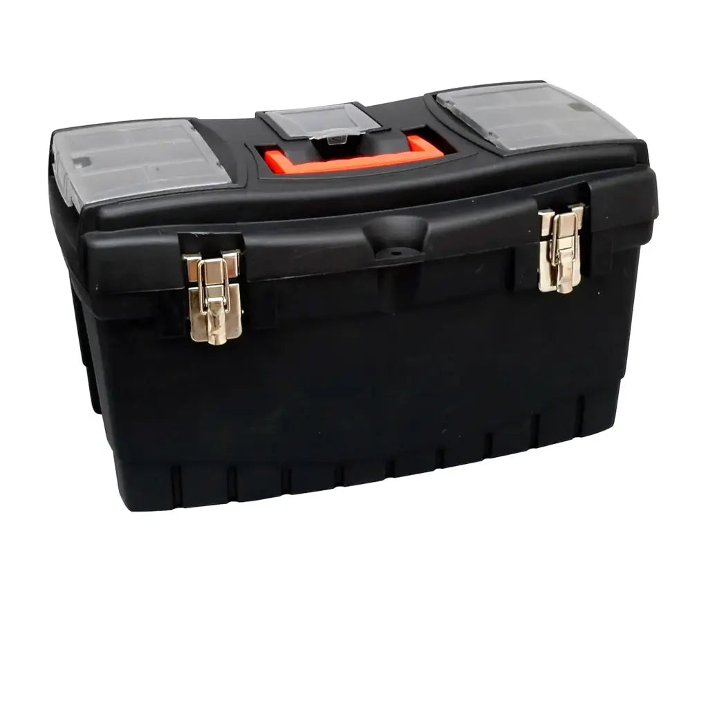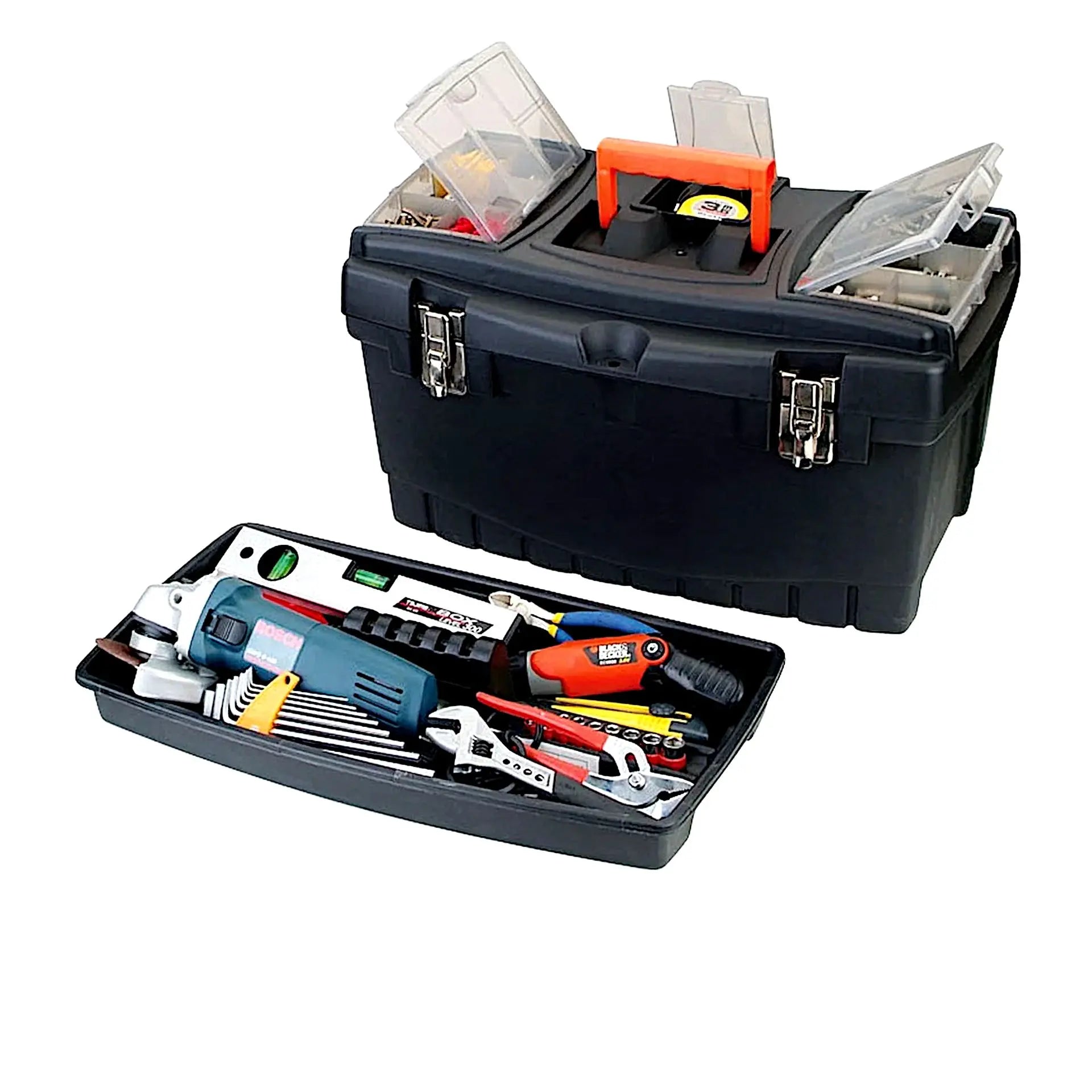 Værktøjskasse i kraftig plast. Med sortimentskasser i låget.