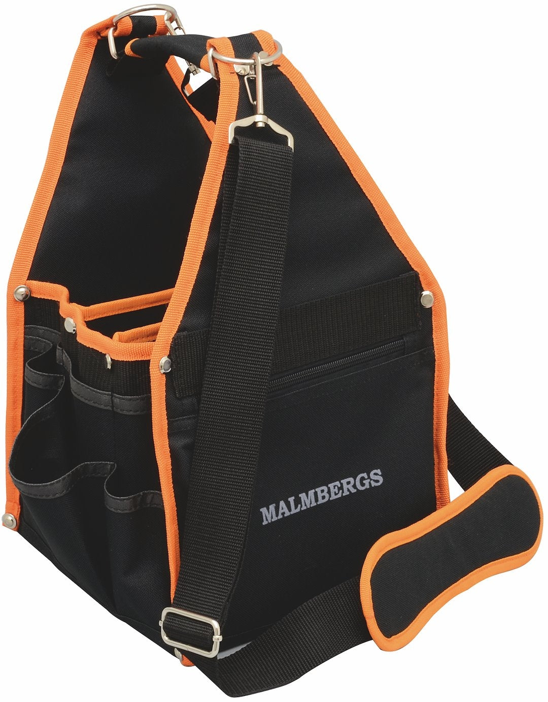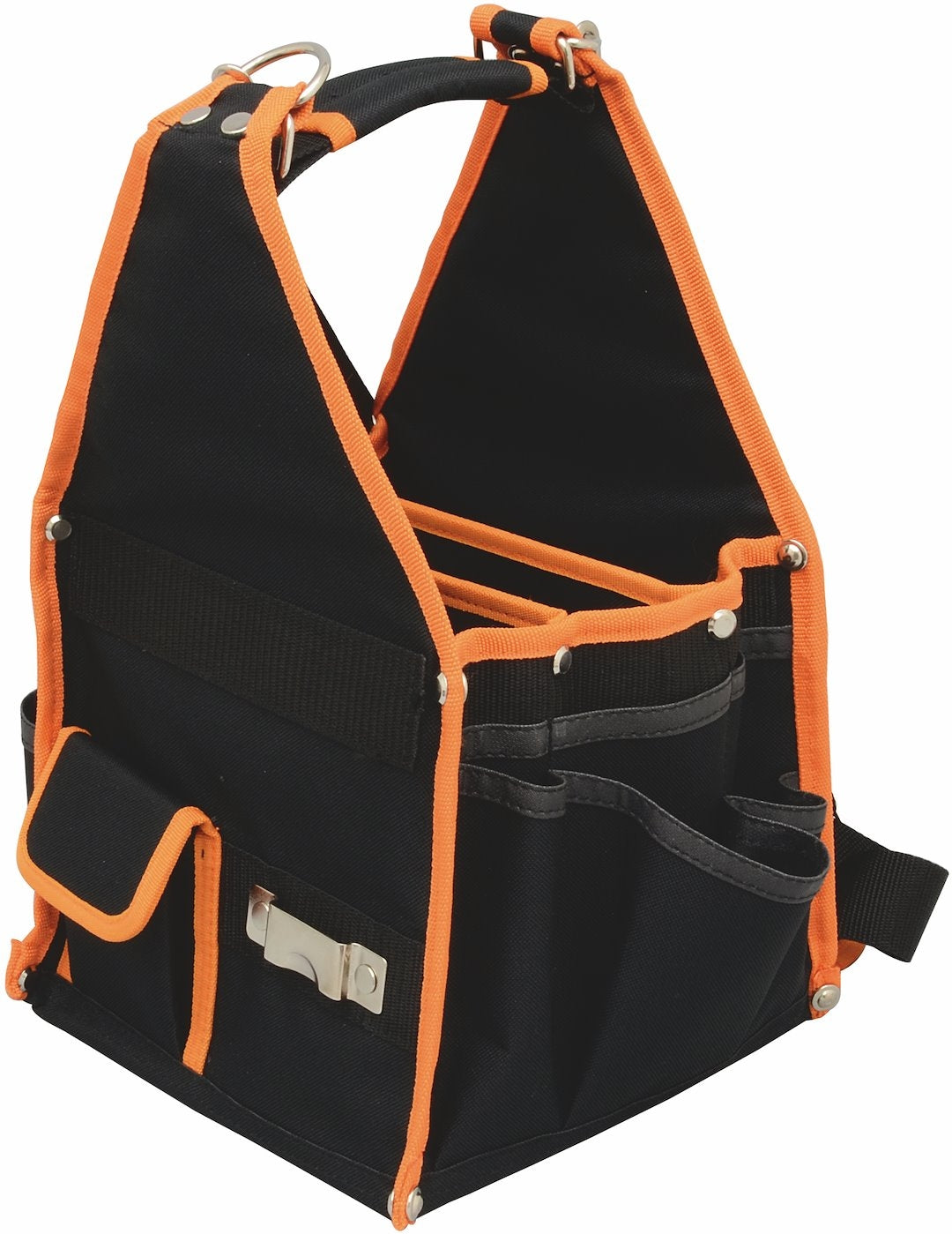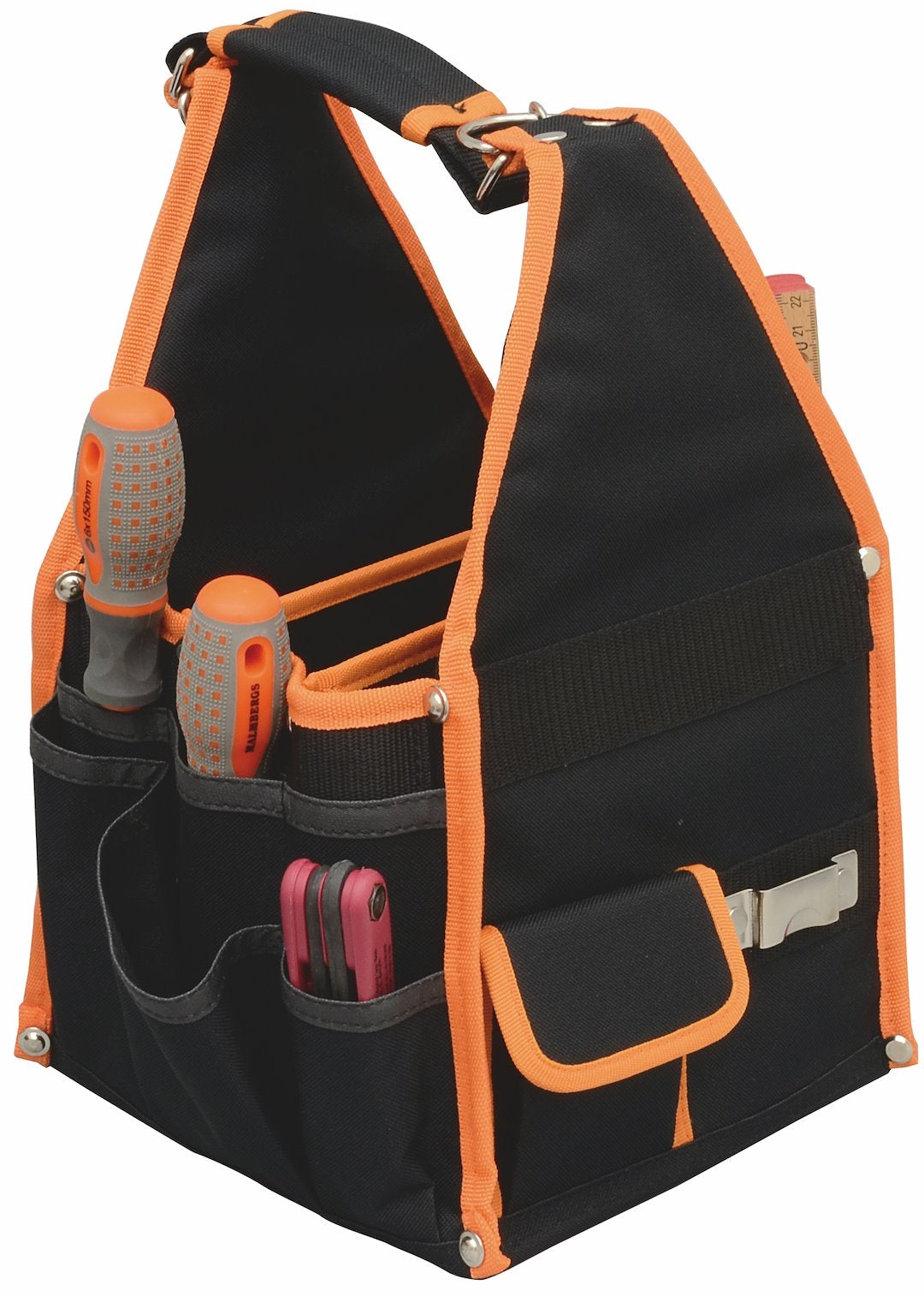 Praktisk værktøjstaske for transport og opbevaring af værktøj m.m. Fremstillet i kraftig polyester. Udstyret med en blanding af 12 stk. store og små rum, 6 stk. blyant-og/eller mejselrum samt rum med lynlås.