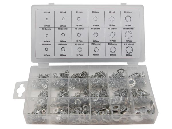 This set contains a wide assortment of lock washers, external washers and internal washers in one convenient kit! Suitable for both home and shop use, these lock washers feature a bright zinc-plated finish to resist rust and corrosion. The lock washers come organized in a resealable, divided PVC case with an index chart for easy, quick identification.