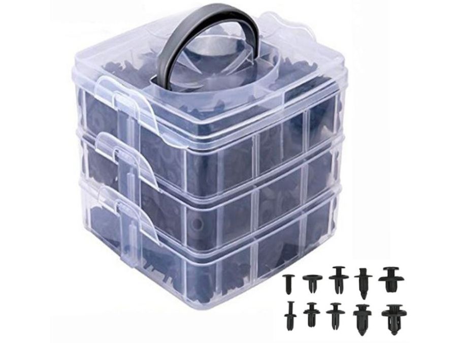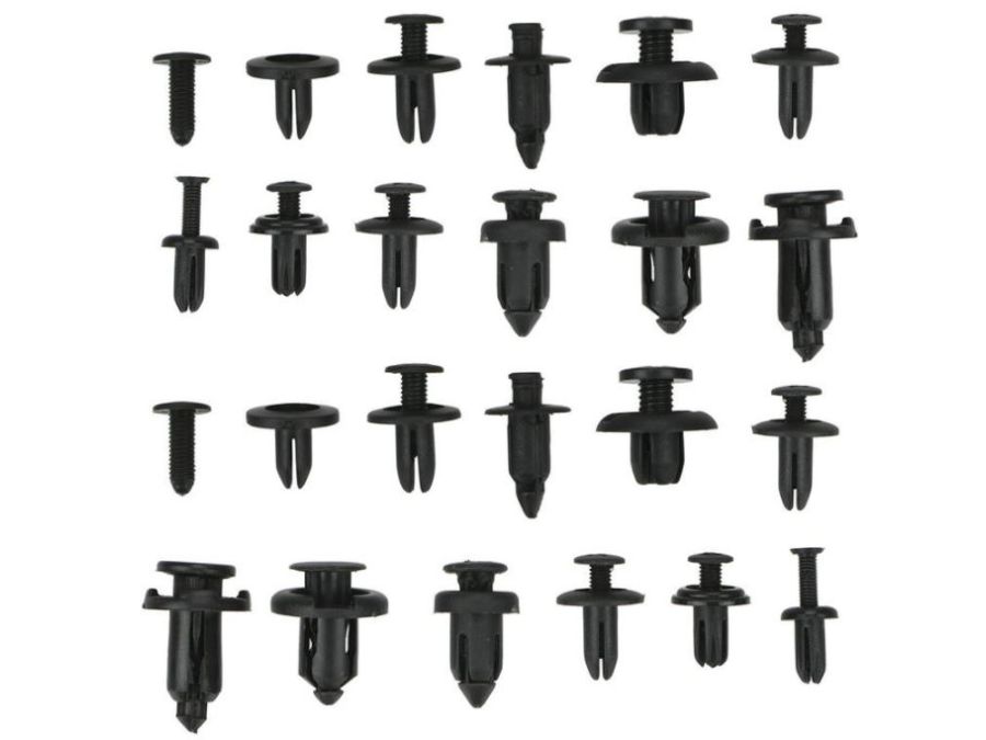 Sortiment af skrue-plastnitte clips. Ofte anvendt til fastgøresle af skærmbeskyttere, kofangere, dørfyldninger eller andre monteringsdele på biler.