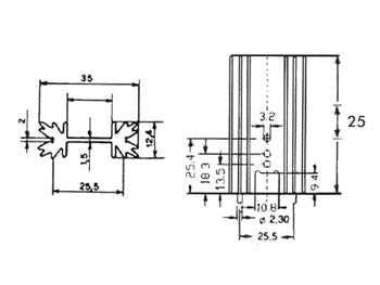 Tekniske detaljer: Hus: TO220 RTH: 10°C/W Størrelse: 25 x 35 x 12,5mm Variant: with 4mm pins (pin width = 25,5mm) Også kendt som: Heat sink, Køleelement, Køleprofil, Kølelegme.