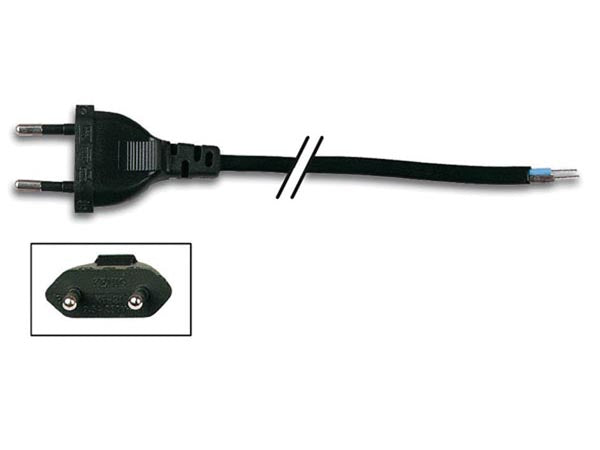 Tekniske detaljer: Stik: EURO (CEE7/16) han til løs ende (afisolert m. tyller) Kabeltype: H03VV-F Inderledere: 2 x 0,75mm² Mærkestrøm: 2,5A / 250V Længde: 1,5m Farve: Sort