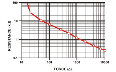 Force sensitiv resistors (FSR) er sensorer, der giver dig mulighed for at registrere fysisk pres, tryk og vægt. De er enkle at bruge og koster ikke meget. Denne sensor er en Interlink model FSR402 med et ca. 18mm rundt sensor areal. Bemærk, at denne sensor ikke kan registrere, hvor på pladen du trykker. FSR er dybest set en modstand, der ændrer sin resistive værdi (i ohm), afhængigt af, hvor meget den trykkes. De er prisbillige og nemme at bruge men dog mindre præcise. De kan også variere fra sensor til sensor (op til 10%). Mens FSR kan registrere vægt, er de et dårligt valg til præcis måling af vægt. FSR er lavet af plastik og forbindelsen er krympet på sarte materialer.