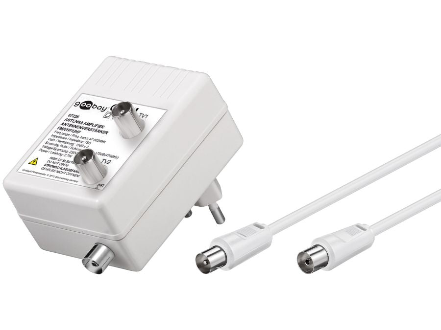 Kompakt 2-vejs antenneforstærker med integreret netstik for 230V tilslutning. Velegnet til forstærkning af DVB-T, og FM signaler.