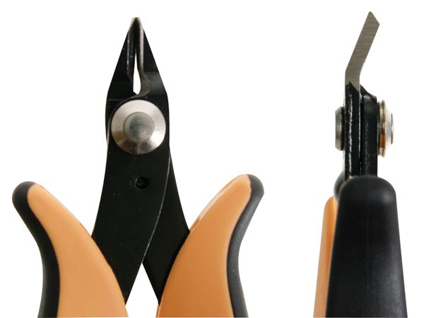 Electronics side cutter plier with tapered head with extra-tough high carbon steel blades for cutting in high-density areas. Non-protruding flat return spring for excellent feel without excessive tension og glare-free black finish.