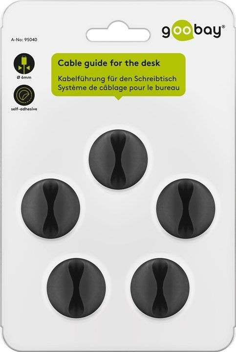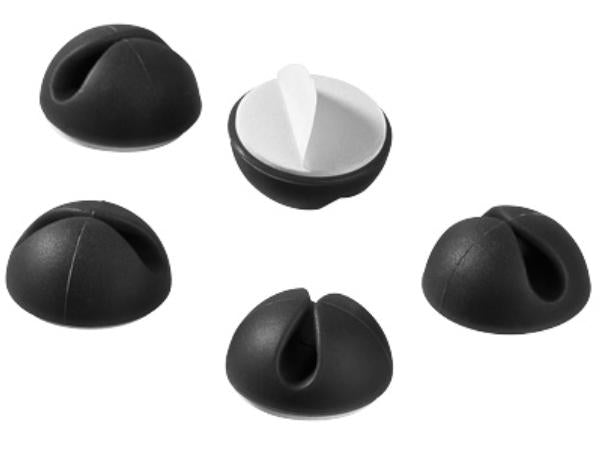 Selvklæbende kabelholdere i sort gummi. 5 stk. til nem fiksering af ledninger, som du ønsker ikke skal falde om bag ved skrivebordet. Også velegnet til kabelføring oppe under skrivebordet. Klæbemidlet afsætter ingen limrester efter aftagelse. Passer til kabler på op til 6mm i diameter.