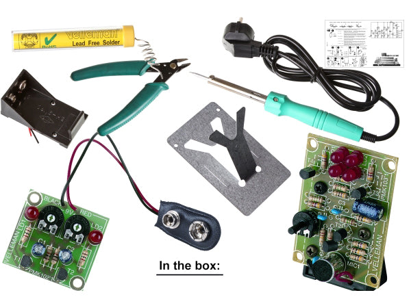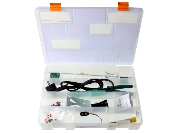WSEDU03 sættet indeholder en loddekolbe, loddetin og værktøj, samt elektronikkomponenter og printplader til to komplette mini KITs. En perfekt introduktion til elektroniklodning.