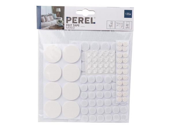 Selvklæbende filtpads- og gummipads-sortiment. I alt 135 stk. Egenskaber: Indhold: Ø15mm filt-pad: 36 stk. Ø20mm filt-pad: 48 stk. Ø38mm EVA gummi-pad: 8 stk. Ø10mm EVA gummi-fod: 22 stk. Ø9m... Se mere
