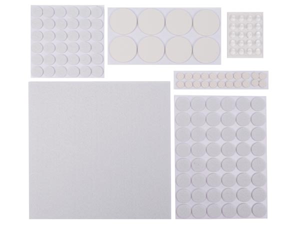 Selvklæbende filtpads- og gummipads-sortiment. I alt 135 stk.