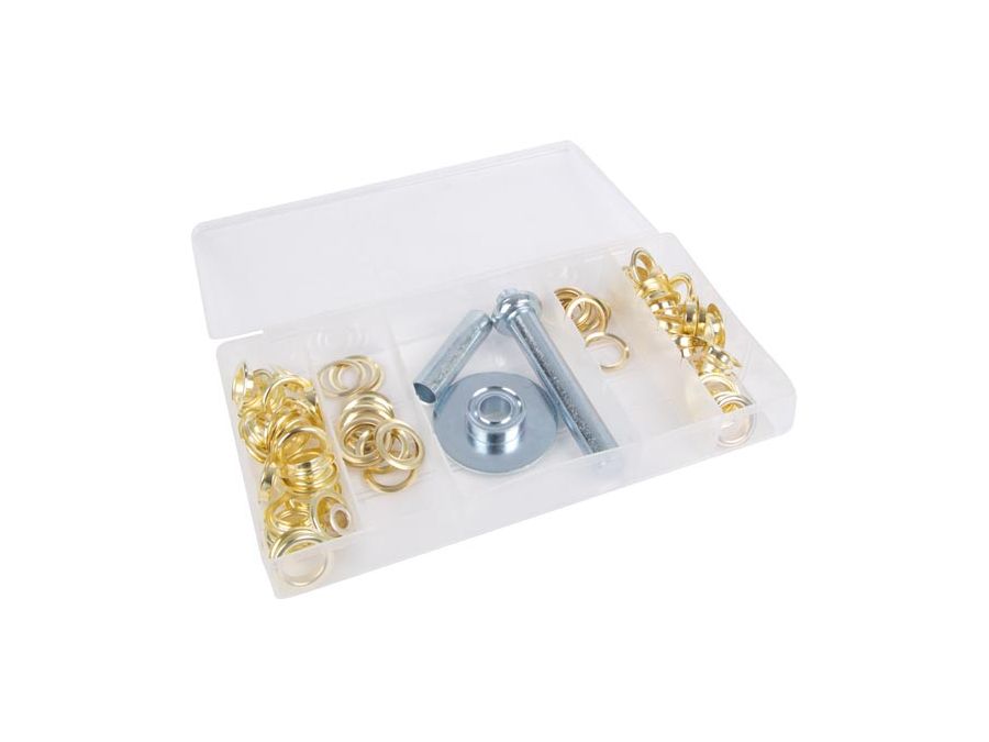 Øjering sortimentboks med øjeringe og hulværktøj. Nyttig til montage af øjeringe i f.eks. presenninger.