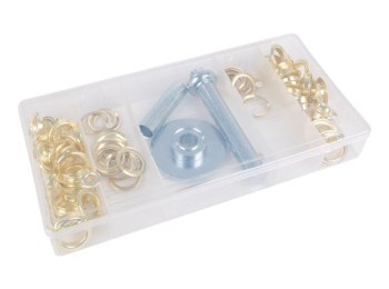 Nice-to-have eylet assortment kit with eylets and punch tool. Usefull for eyelet mount in e.g. tarpaulins.
