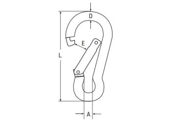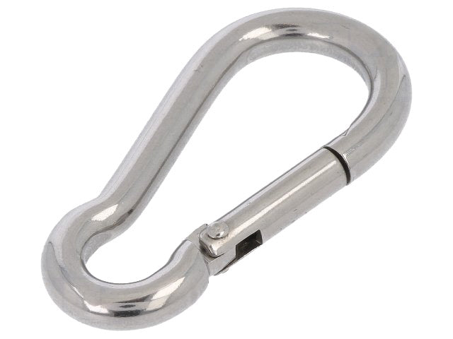 Karabinhage i syrefast rustfri A4 stål. Bemærk: Denne type karabinhage er markant mere holdbare end de billigere udgaver fremstillet i aluminium eller galvaniseret stål.
