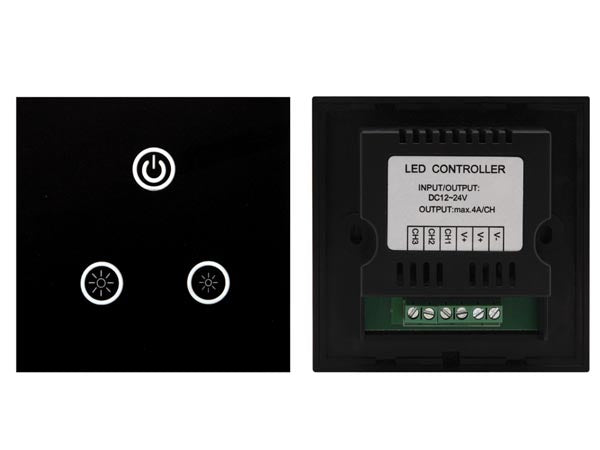 1 kanals LED lysdæmper med tænd/sluk samt op/ned dæmpning. Tilslut op til 3 LED strip grupper (maks. 4A pr. gruppe) og du kan via dette panel kontrollere lyset for alle tre grupper synkront.