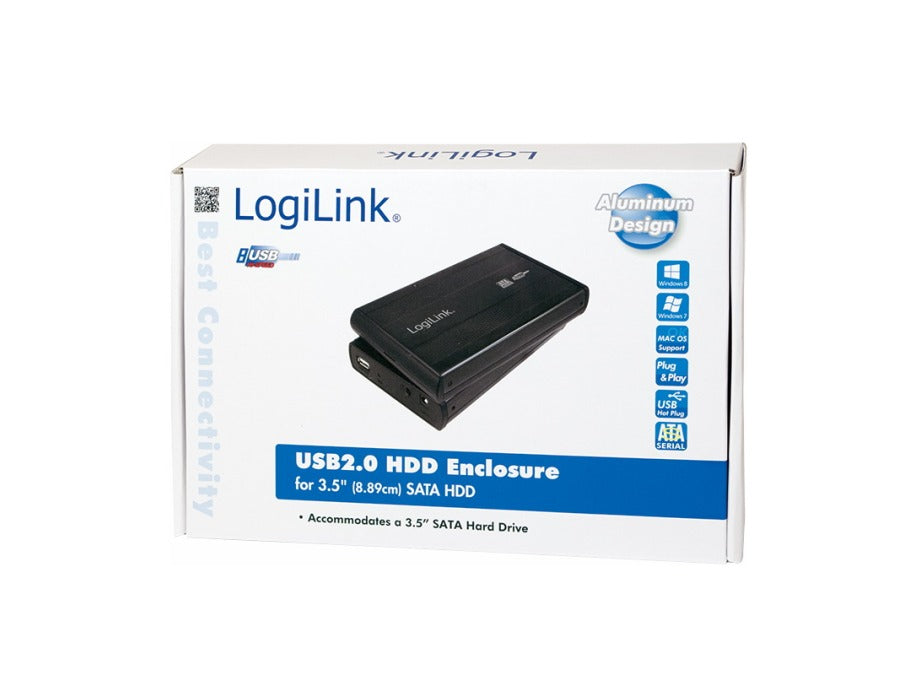 External aluminum case from LogiLink for installation and operation of 3.5 inch S-ATA hard drives. Standard size. Compatible with all notebook hard drives. Connection via PC or notebook via the fast USB 2.0 interface. USB stands for Universal Serial Bus and is working with a transfer rate of up to 480 Mbit/s. The connection is simple and the device is recognized by modern operating systems automatically.