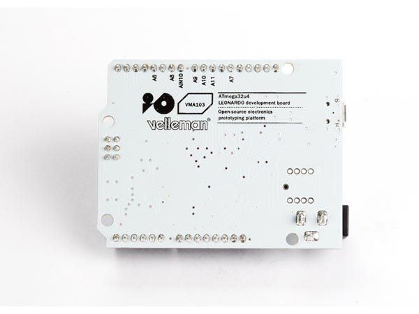WPB103 fom Velleman is 100% functionally identical with Arduino® LEONARDO. This board is a microcontroller board based on the ATmega32u4. It has 20 digital input/output pins (of which 7 can be used as PWM outputs and 12 as analog inputs), a 16 MHz crystal oscillator, a micro USB connection, a power jack, an ICSP header, and a reset button. It contains everything needed to support the microcontroller; connect it to a computer with a USB cable or power it with a AC-to-DC adapter or battery to get started.