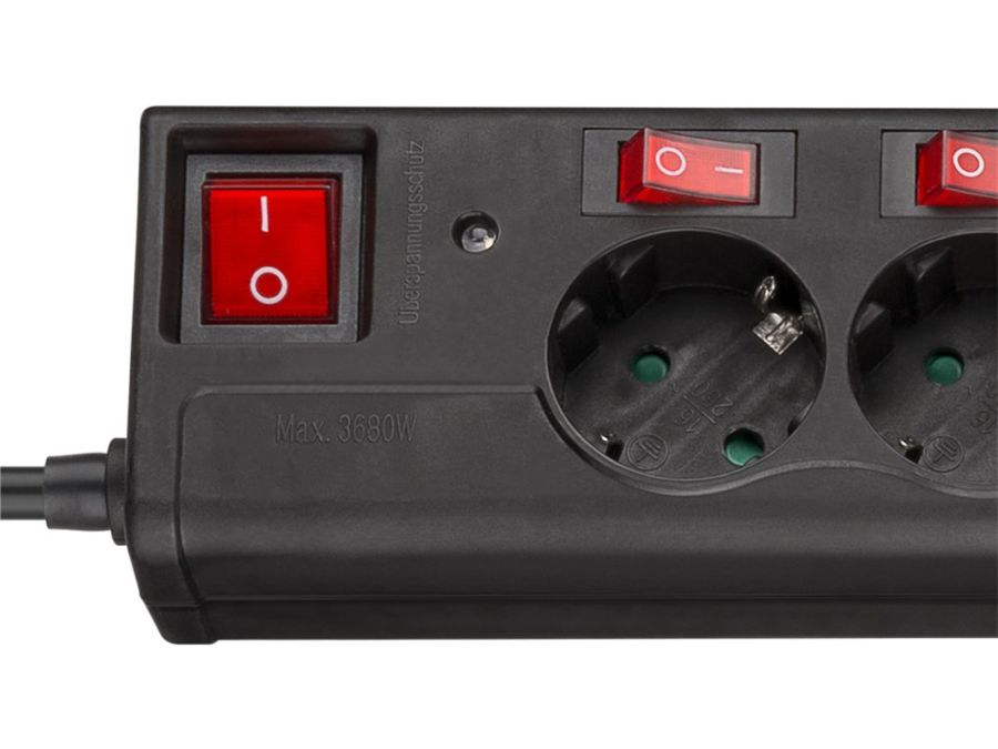 - Six illuminated switches for separately switching off individual devices and additional main switch for the whole socket strip