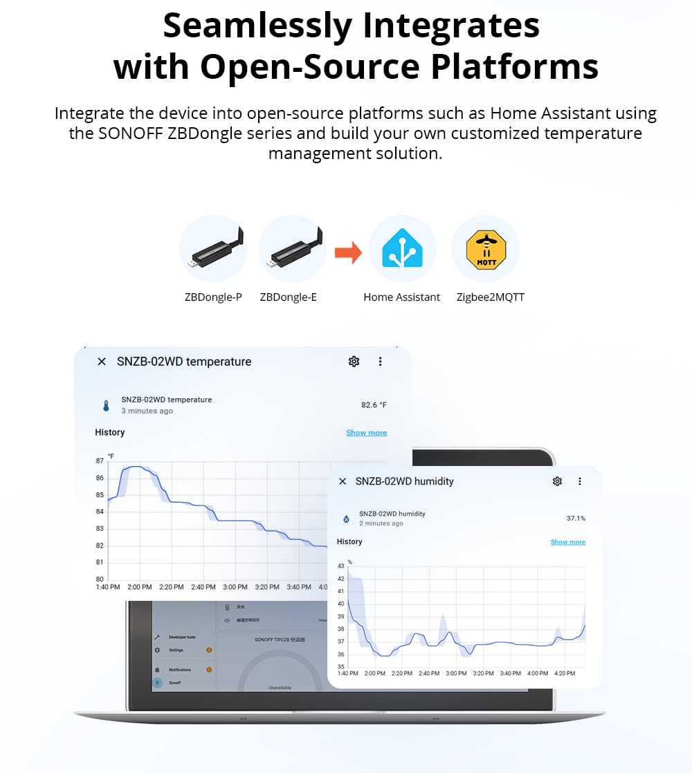 SNZB-02WD understøtter Zigbee-hubs, der bruger Zigbee 3.0-protokollen, inklusive enheder som SONOFF iHost, NSPanel Pro, ZBBridge-P, ZBBridge-U, ZBDongle-E, ZBDongle-P, Echo 4th Gen, Echo Show 2ndGen og Echo Plus 2nd. *Bemærk: Amazon Hub understøtter ikke fugtighedsovervågning. SNZB-02WD kan også integreres i open source-platforme som Home Assistant via SONOFF ZBDongle-serien, så du kan oprette dine egne tilpassede temperatur-/fugtighedsstyringsløsninger.