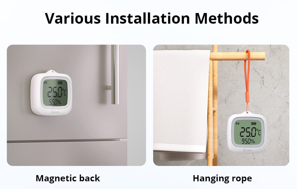 SNZB-02WD is a Zigbee LCD smart temperature and humidity sensor designed with a unique structure. The core sensor is protected by an IP65-rated housing and detects external temperature and humidity through an internal waterproof, breathable membrane, ensuring reliable performance even in humid or misty environments. This makes it ideal for use in places such as windows and gardens to monitor external conditions.