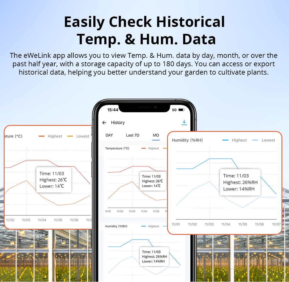 With the eWeLink app, you can view temperature and humidity data by day, month, or up to the last six months, with a storage capacity of up to 180 days. You can access or export historical data, which helps you better understand your garden and optimize plant care. Create smart scenes through the eWeLink app, receive notifications for abnormal activity, or set up automation based on temperature or humidity changes. For example, you can receive instant notifications on your phone if a power outage causes a sudden temperature drop in your reptile tank. When the air becomes too dry, you can automatically activate the water valve for irrigation to maintain optimal garden humidity.