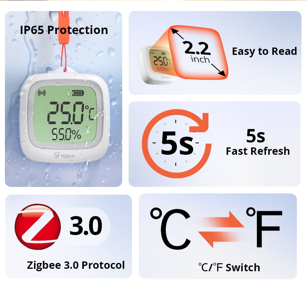 SNZB-02WD har en 2,2-tommer LCD-skærm, der tydeligt viser temperatur og luftfugtighed. Den modstår UV-stråling, hvilket sikrer langvarig holdbarhed selv i direkte sollys, og den er i stand til at måle temperatur i miljøer med lav temperatur. Med en nøjagtighed på ±0,2° for temperatur og ±2% RF for luftfugtighed giver den næsten øjeblikkelige og pålidelige data.
