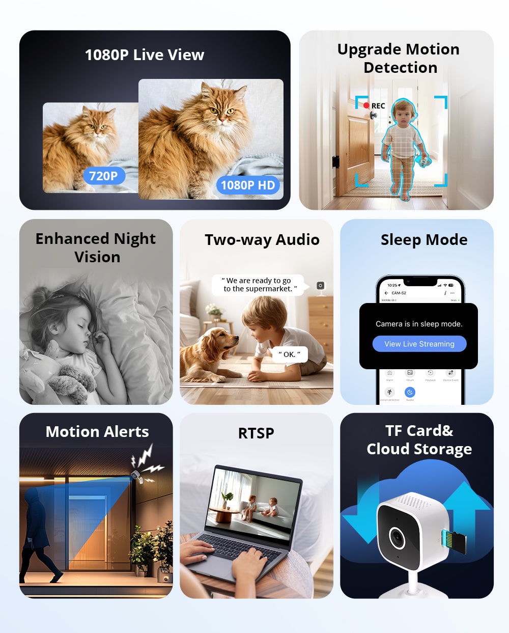- Local & Cloud Storage: Choose to store videos using cloud storage via the Camera Plan (sold separately), or save them locally with a TF card (sold separately).