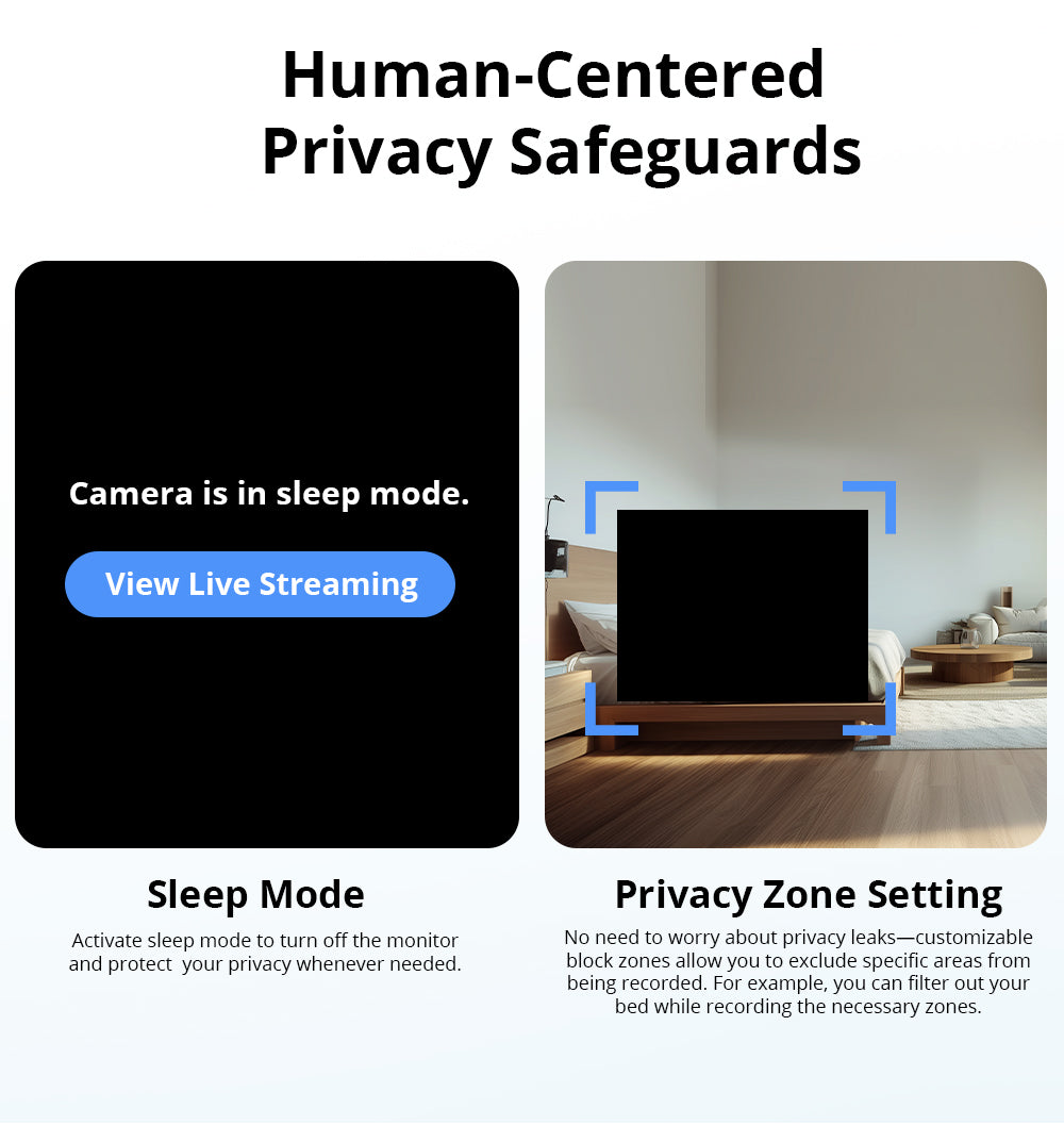 - Privacy Safeguards: Activate sleep mode to turn off the monitor and protect your privacy. Customizable privacy zones allow you to exclude specific areas from being recorded, so you can rest assured that your privacy is secure.