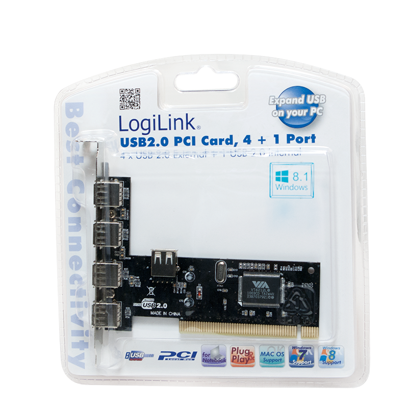 The LogiLink PCI interface card extends your PC by four external and one internal USB 2.0 port to connect compatible devices (backward compatible to USB 1.0). It is mounted in an available PCI slot of your PC and, thanks to plug-and-play (PnP), identified by the current operating systems automatically detected. The automatic IRQ addressing prevents address conflicts. The internal and external connections are standardized and work in any PC.