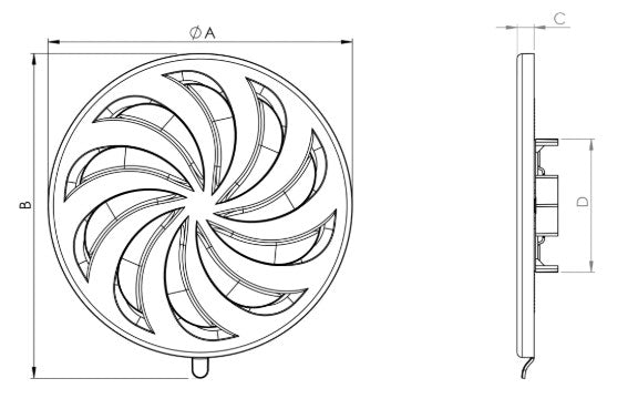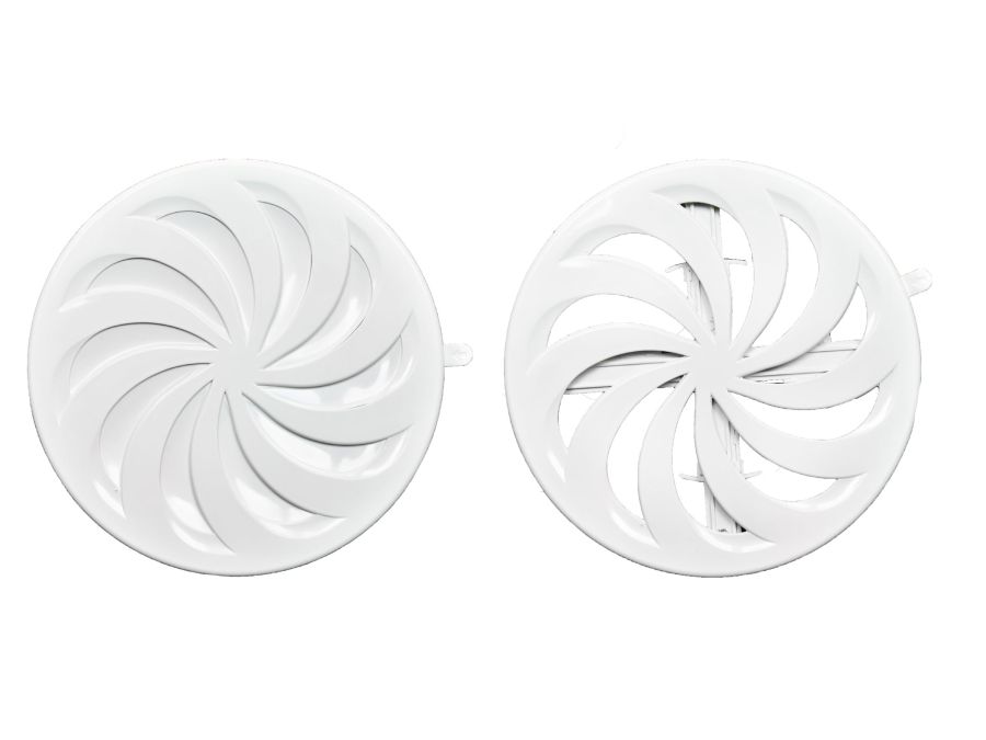 Ventilation grills like these are typically meant for mounting on the ceiling - that is why the shape of the holes directs the air stream in a straight way, unlike the grills designed for walls, where the blinds are directed at an angle. However, this specific product can also be mounted on a wall. Thanks to the unique design, it fits into any room - regardless of whether it hangs on the ceiling or wall. It is possible to regulate the flow of ventilated air, so it works very well in rooms with high humidity, such as bathrooms or laundryrooms. Changing the air flow depending on the needs improves comfort. On the side of the grill there is a discreet handle, so that you avoid having ugly and quickly dirty strings. The back of the grill is made of a cross system of latches, thanks to which the grill can be mounted at the end of a ventilation duct of any shape with a diameter between 80-150mm. The universality of the idea solves the problem with an unusual diameter and a lack of knowledge regarding size for your project.