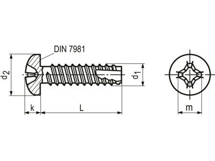 Tekniske detaljer: Hovedform: Panhoved Kærv: Phillips Gevind: fuld gevind Materiale: Stål Materialeudførelse: indsatshærdet Overflade: elzink blå Hårdhed: 450 HV Størrelse (se billeder): d1:... Se mere