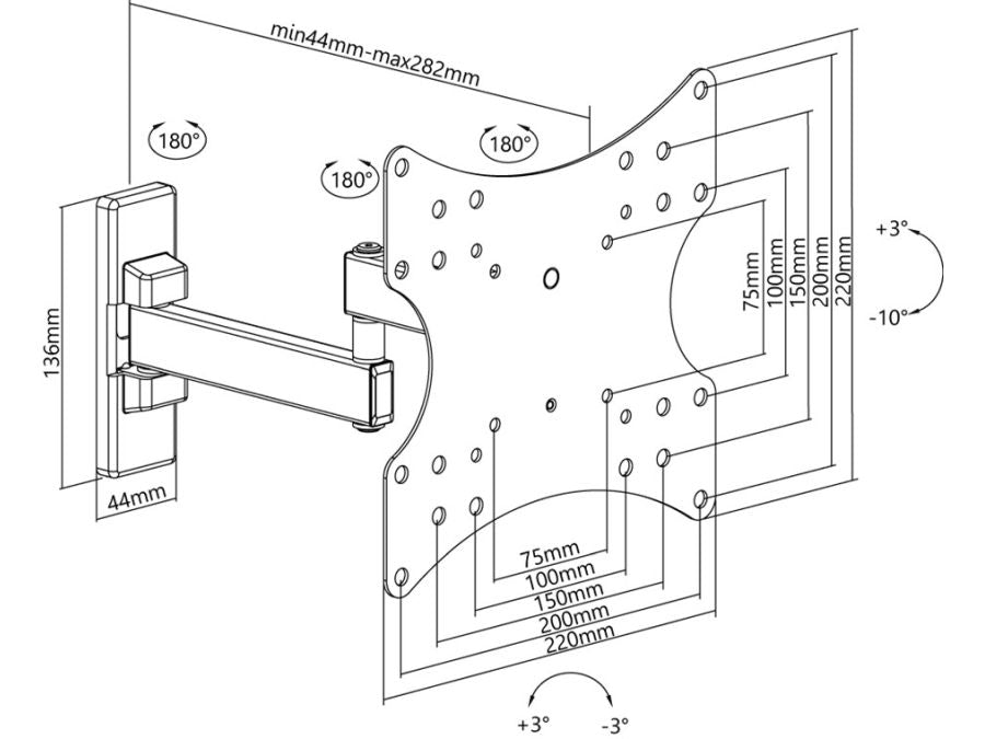 - The wall mount keeps the TV in the position with only 44mm elegantly flat and space-saving on the wall and can be extended up to 282mm to achieve the optimal viewing angle.
