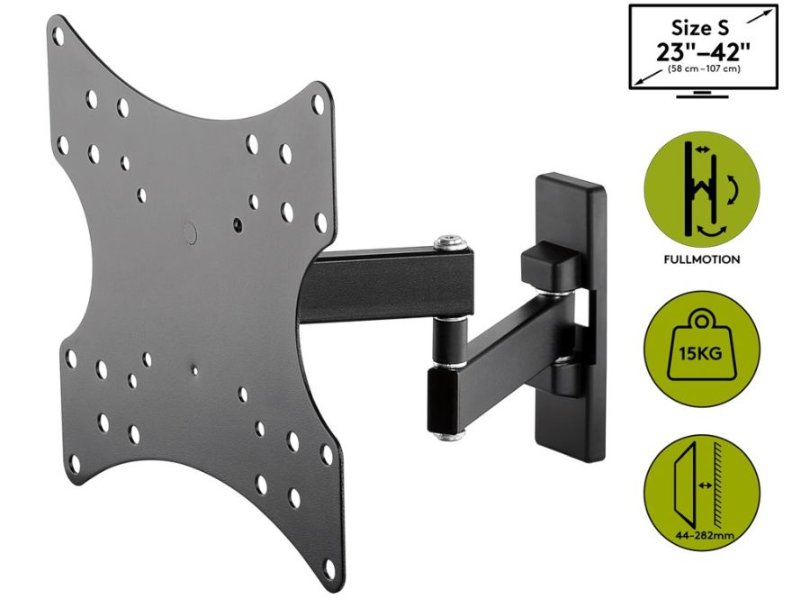 For TVs from 23" to 42" (58-107cm) , fully movable double arm joint (swivel and tilt) up to 15kg