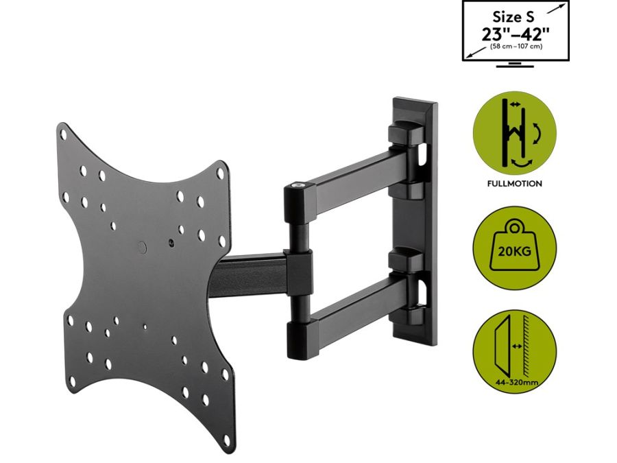 For TVs from 23" to 42" (58-107cm) , fully movable double arm joint (swivel and tilt) up to 20kg.