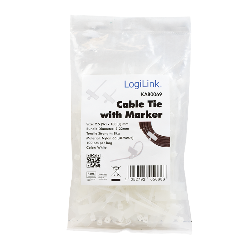 Kabelstrips m. skrivefelt - 2,5x100mm, Hvid (100 stk.)