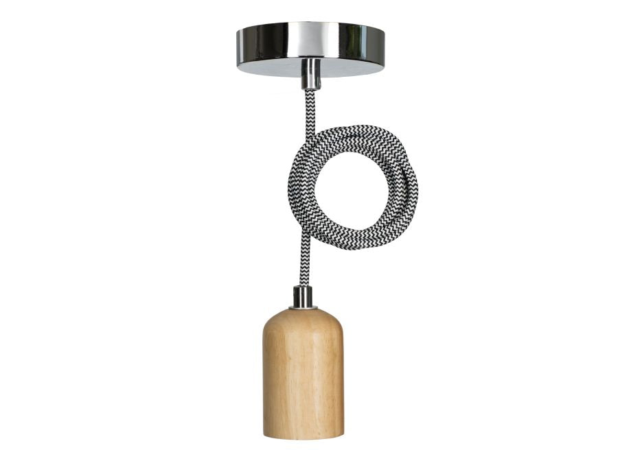 Pendant Light Lima E27 Wood with 1.5M Textile Cable Black/White 2x0.75mm2 and Ceiling Cup Silver CLII Max 60W.