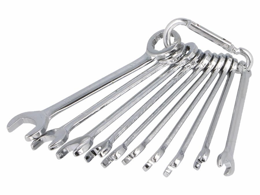 Kombinationsnøglesæt til små bolte fra 4 til 11mm. Leveres med praktisk karabinhage for organiseret samling og ophæng i bæltestrop.