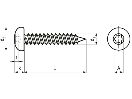 Tekniske detaljer: Hovedform: Panhoved Kærv: TORX® Gevind: fuld gevind Materiale: Stål Materialeudførelse: indsatshærdet Overflade: elzink blå Hårdhed: 450 HV Størrelse (se billeder): d1 : S... Se mere