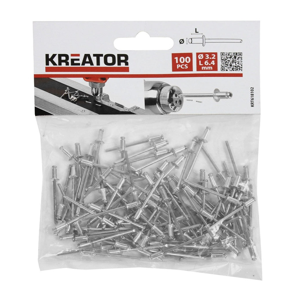 KREATOR alu. popnitter i høj kvalitet. Tekniske detaljer: Hoveddiameter (Ø): 3,2mm Hovedlængde (L): 6,4mm Antal pr. pose 100 stk.