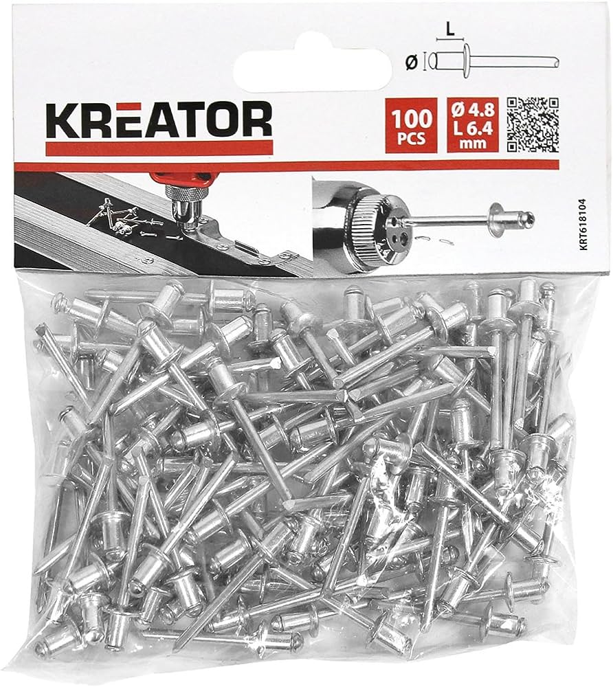 KREATOR alu. popnitter i høj kvalitet. Tekniske detaljer: Hoveddiameter (Ø): 4,8mm Hovedlængde (L): 6,4mm Antal pr. pose 100 stk.