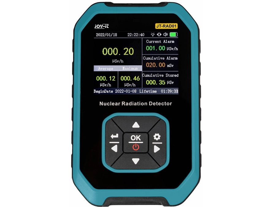 JT-RAD01 er en strålingsmåler til detektering af Gamma-, Beta- og røntgenstråling og er kendetegnet ved dens særligt lette håndtering, høje målestabilitet og dets handy og robuste design. Måleren har et stort LCD-farvedisplay med baggrundsbelysning. Måleresultaterne kan både vises som overskuelig statistik og som grafevaluering.