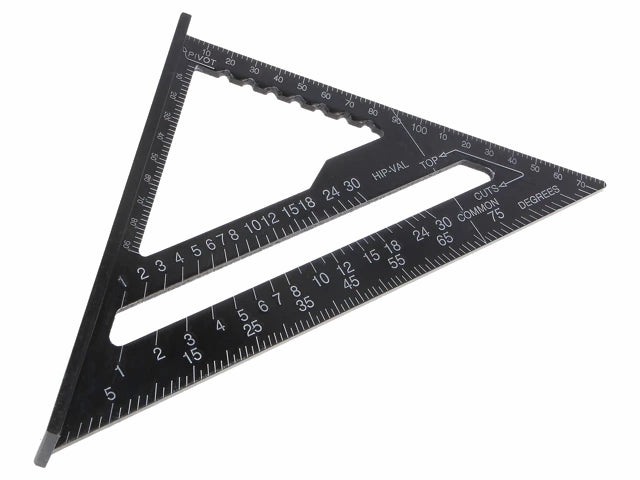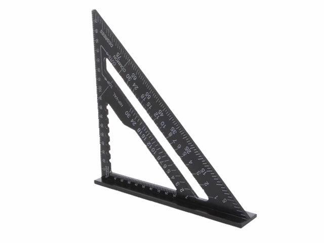 Prof. aluminium trekantvinkel med vinkelmåler i grader, COMMON (decimeter pr. meter) og HIP-VAL (til konstruktion af spær). Multifunktionel, udover vinkler tilbyder den også linjeguide-funktion til parallelle linjer i intervaller på 10mm fra 20-80mm.