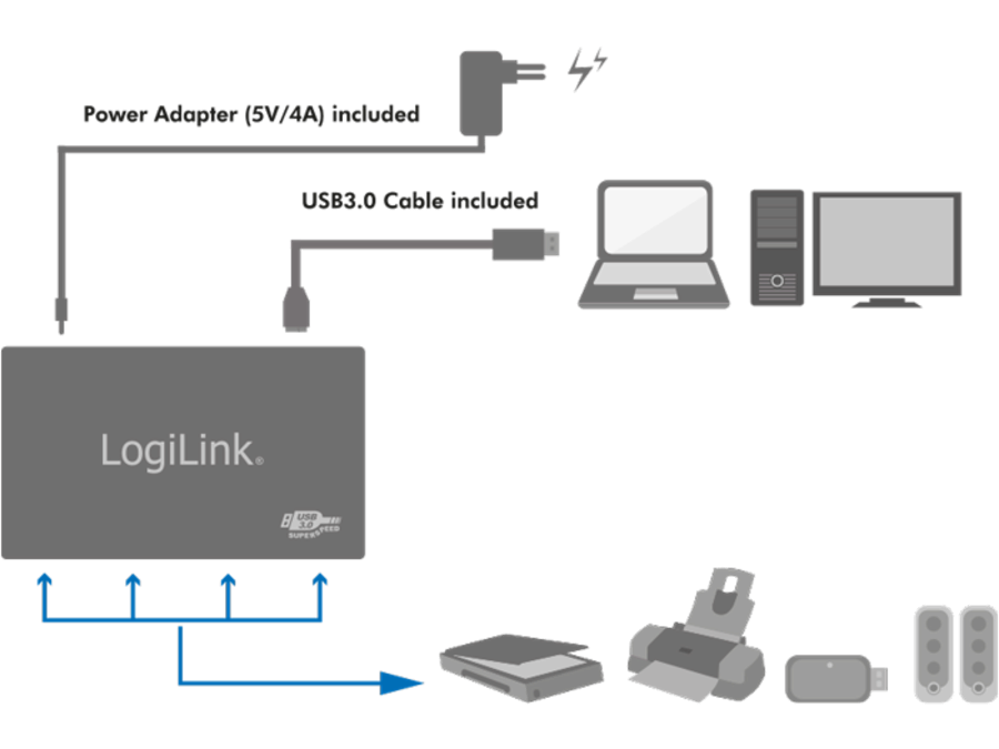 The fast hub supports the USB 3.0 standard with up to 5 GBit/s and expands your connection to another 4 ports. You can connect all older USB devices. A 5V/4A power supply and a USB 3.0 cable are included.