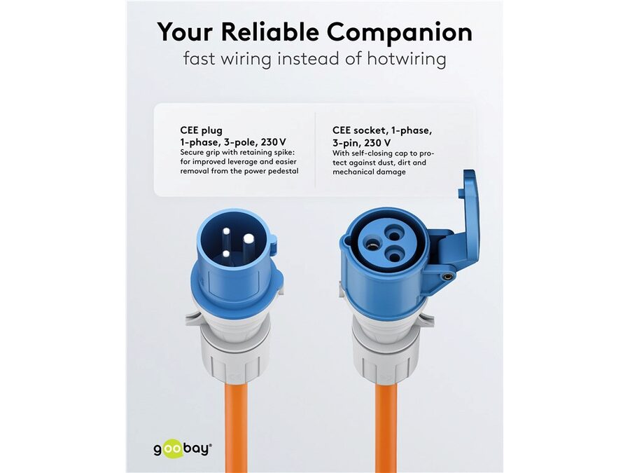 The practical solution for camping and outdoor use: The CEE cable quickly and easily extends existing power cables â as a reliable power source for all electrical functions in a motorhome, caravan or on construction sites. Safely connected to the 230 V mains supply at the campsite, it makes every outdoor tour a relaxed energy experience. Full power, full convenience.